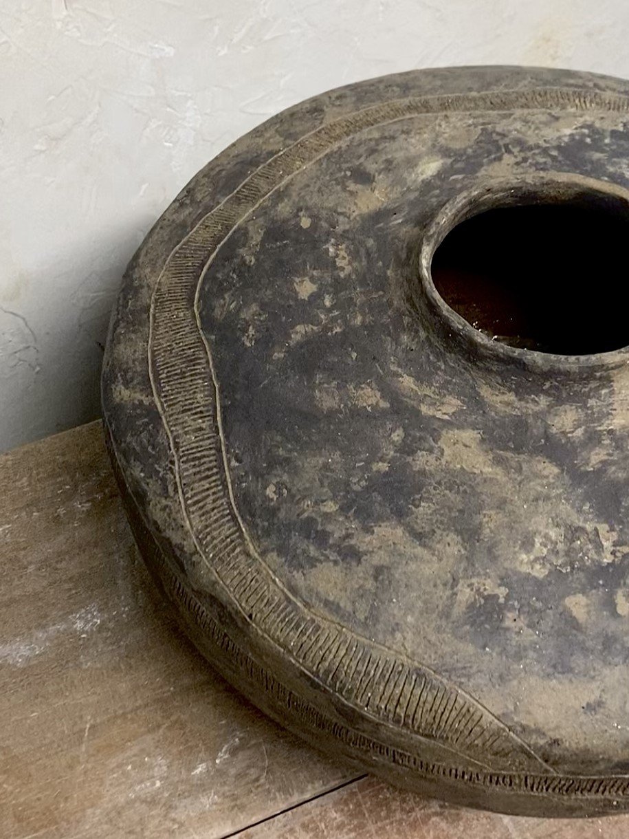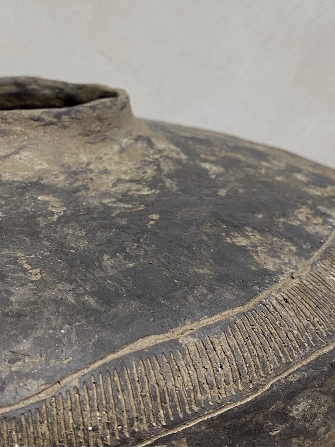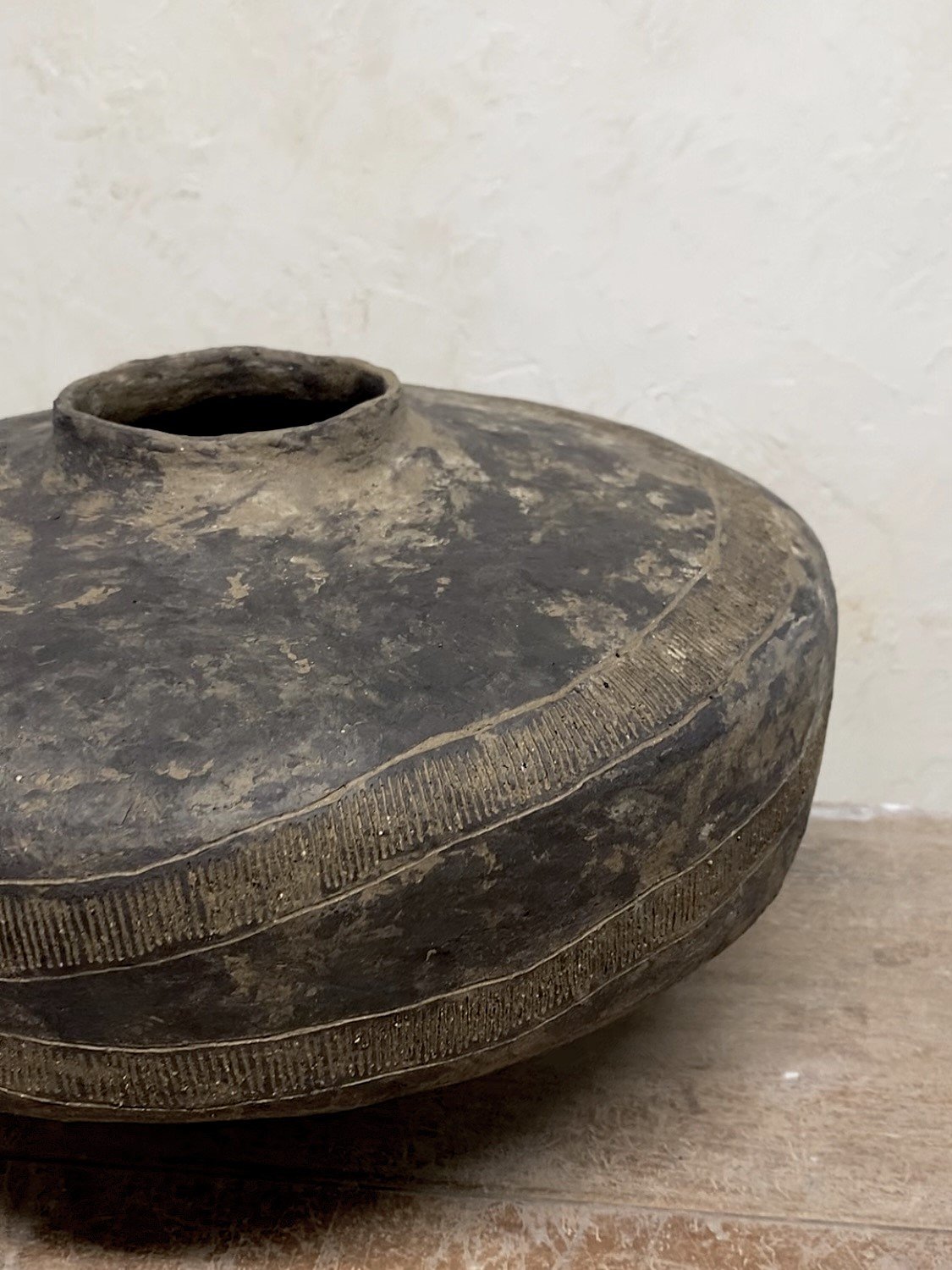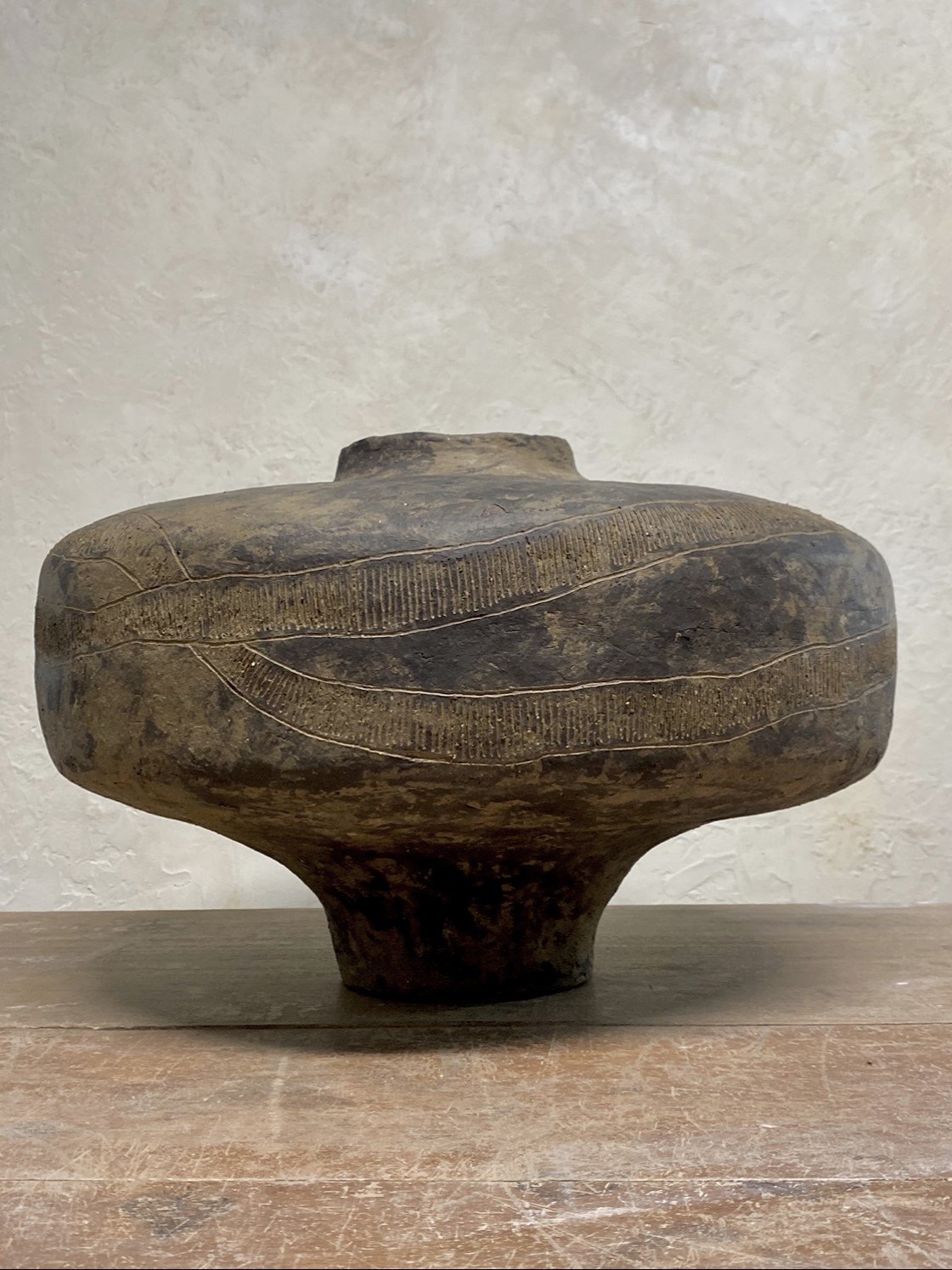 Raw and elemental, this vessel holds a quiet strength. Its rich dark surface carries the depth of aged stone, with organic textures that shift in the light. Sculptural and grounding, it makes a bold yet understated presence in any space. This piece is laced with two carved rings that wrap around it, adding further visual interest from each angle.